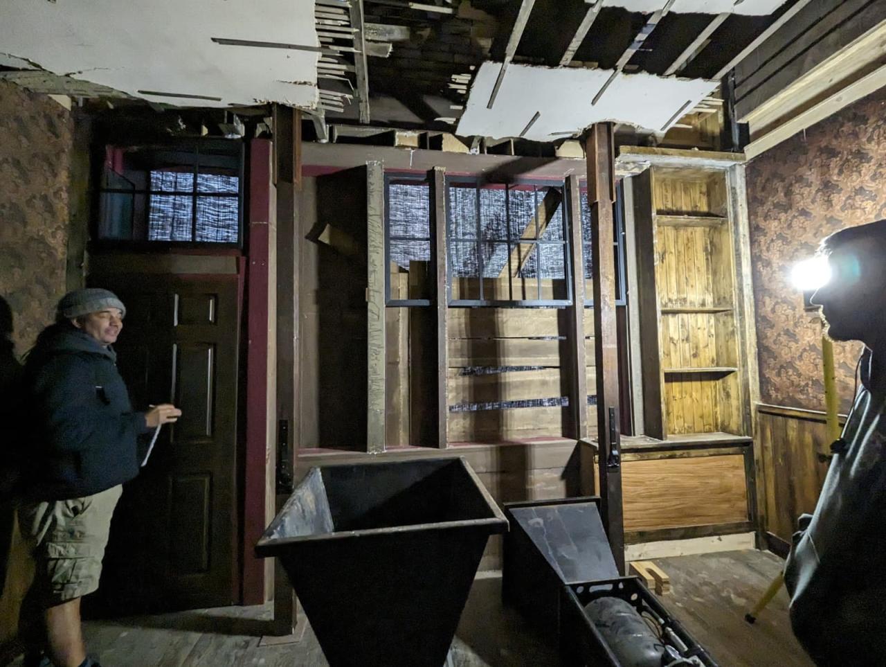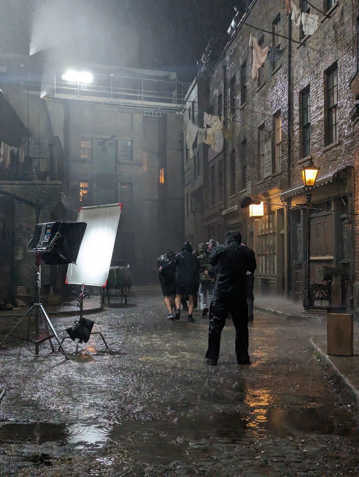 But the undisputed giant of the season was the reconstruction, and destruction, of two full storeys of Saul Woolfe’s tailor shop. Over three intense weeks, the workshop transformed sheets of fibreboard into an intricate soft-set building, complete with hand-cut balsa wood details, period-correct mouldings, and carefully aged paintwork to match the existing streets. Moving the structure into place was a logistical dance involving scissor lifts, riggers, and a weather forecast that refused to cooperate. Once erected, the team painted and dressed the set in the open air, hoping the winter rain wouldn’t warp or weaken the materials before the big moment. This build sat outside for three days as other scenes filmed at the Blue Coat Boy and luckily withstood against the winter weather. On the day of destruction, the SFX team executed a meticulously timed sequence involving air mortars, smoke machines, det cord, and several Harvey’s positioned to blow out floors and peel open the building’s façade. Radios buzzed, countdowns echoed through the alley, and after a final safety check, the charges fired sending debris, dust, and smoke bursting outward in a stunning controlled collapse. It was the kind of behind-the-scenes moment that defines a season: weeks of work culminating in seconds of spectacular onscreen chaos as the actors battle their way through the dust.